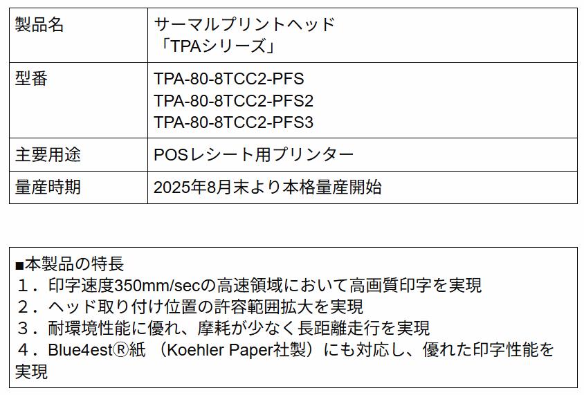 京セラは、コンビニエンスストアや飲食店などの小売業や接客業を中心に広く活用されているPOSレシート用途向けに、印字速度350mm/secの高速領域で高画質印字を実現したサーマルプリントヘッド「TPAシリーズ」を開発、2025年8月末より本格的に量産を開始する。