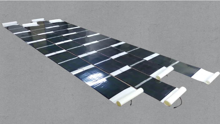 日揮とPXPは、2025年4月よりまずは1年間を目安に、カルコパイライト太陽電池単体を使用した大面積モジュールによるキロワット規模の発電実証を横浜市内の日揮グループ所有施設内で開始した。同実証で使用する発電モジュールは、あらかじめ電気的に接続した複数の薄膜太陽電池を基材シート上に並べて10m2という大面積を実現したもので、このような手法で薄膜太陽電池の大面積化を試みた実証は国内では初めて。