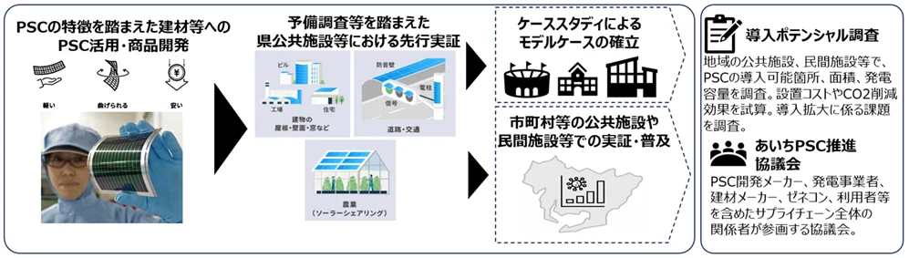 ペロブスカイト太陽電池普及拡大プロジェクトでは、PSCの導入ポテンシャル調査に加えて、先行実証としてアイシンが研究開発※1するPSCを愛知県内の公共施設などに設置し、導入拡大に伴う課題の確認とその解決策を検討する。その後、ほかの公共施設や民間施設でも導入実証を行い、導入モデルケースを確立することで、愛知県で全国に先駆けた社会実装を目指す。
