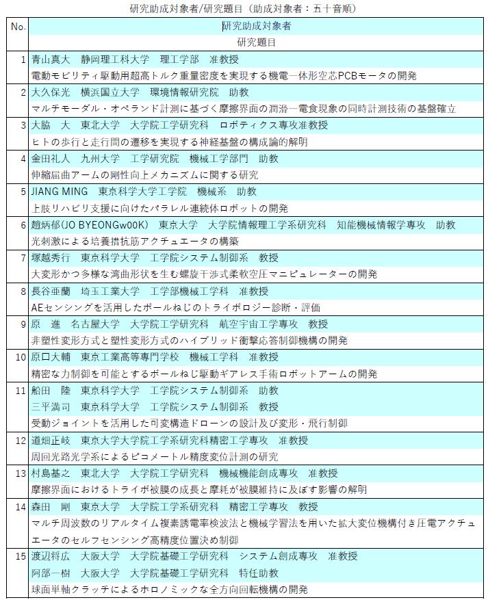2024年度の助成対象は、研究助成には、静岡理工科大学理工学部 青山真大准教授の「電動モビリティ駆動用超高トルク重量密度を実現する機電一体形空芯PCBモータの開発」など15件が決定された。2024年度の応募助成研究課題の傾向としては、昨年度に引き続き、発展が目覚ましいロボット機構と制御を対象とする研究対象の比率が高くなっている。