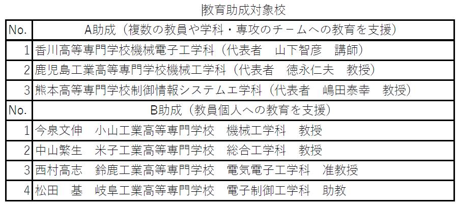教育助成には、複数の教員がグループで、複数の学年、学科を対象とするA助成には香川高等専門学校をはじめとする3校が、単一のメカトロニクス関連教育科目の1名の教員を対象とするB助成には今泉文仲教授(小山工業高等専門学校)をはじめとする4名が決定。