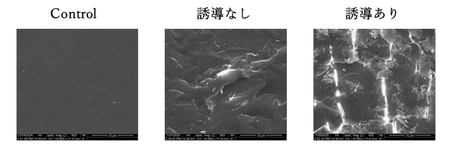 また、真の PP 分解菌の発見確率を上げるために、添加剤を含まない PP フィルムを実験に用いた。その結果、約 10 株の候補株を単離することに成功した。次に、これら候補株を用いて、無添加 PP フィルムの分解能を評価した結果、数株において明確な分解痕を確認した。特に PP9 株は、1 週間で 0.11%の PP フィルムを分解した。さらに、培養時に酵素の誘導剤としてヘキサデカンを少量加えることで、分解率は0.79%に向上した。