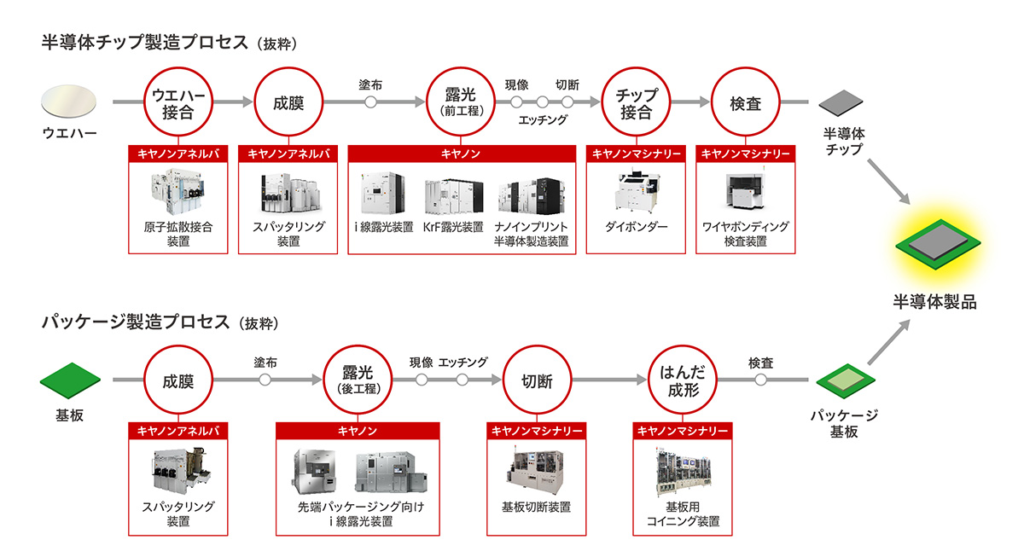 キヤノングループでは、半導体デバイス製造プロセスで使用される製造装置や、パッケージ基板製造プロセスに使用する製造装置のラインアップを有している。