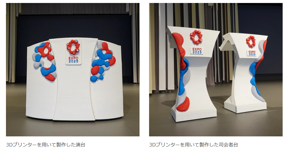 鴻池組とスワニーは2025年3月、大阪・夢洲の2025年日本国際博覧会施設整備事業小催事場建設工事(施設正式名称:EXPOナショナルデーホール)において、3Dプリンターを用いて製作した演台・司会者台を備品の1つとして納品した。原料には当社現場から回収した、資材の梱包などに使用されるPPバンドを用した。