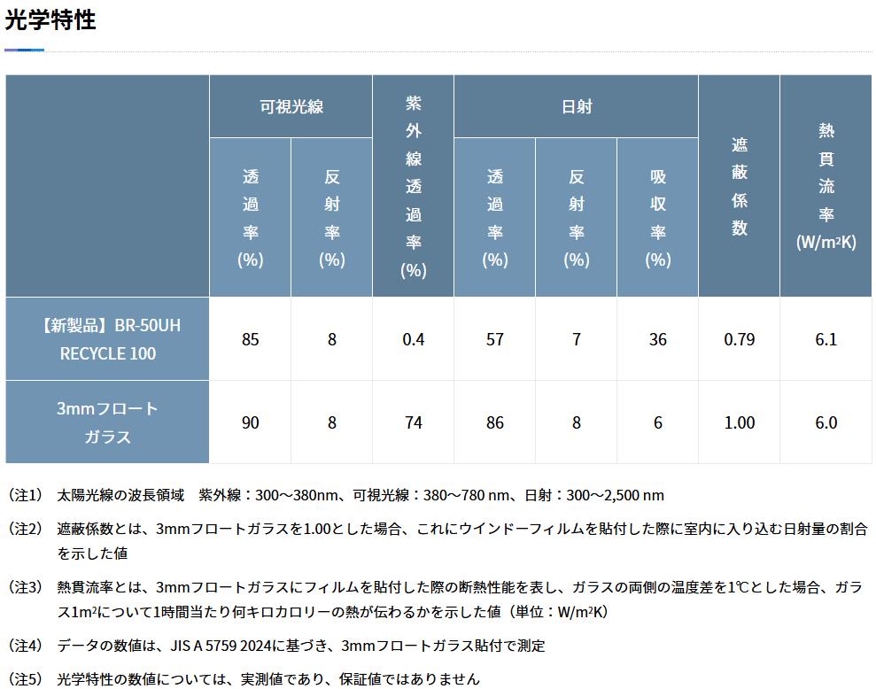 *2 日射透過率、紫外線透過率は3mmフロートガラスに「BR-50UH RECYCLE 100」を貼付し測定