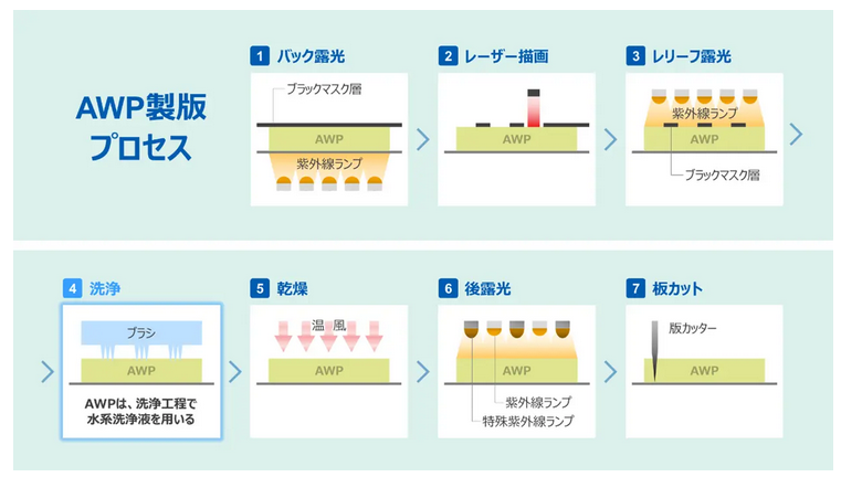 ※3 「AWP」(Asahi Water washable Plate):印刷版の製作工程において、従来の有機溶剤系洗浄液から水系洗浄液に変更することで、有機溶剤の使用をなくした当社独自の製品。