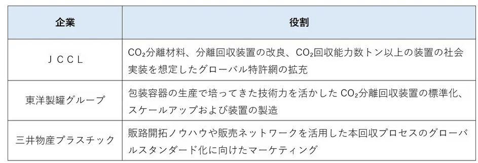 このたび、環境負荷の低減を目指し、JCCLが保有する省エネルギー型CO₂分離回収技術を早期に社会実装するため、東洋製罐グループが包装容器の製造で培ってきた技術力および三井物産プラスチックの販売網等を活用し、共同で取り組みを開始する。