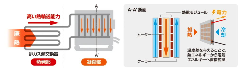 ※1 熱媒体の一部分が加熱され沸騰し、別の一部分が冷却され凝縮することによって、自然に循環する現象(サーモサイフォン)を利用し、廃熱から熱電モジュールへ熱エネルギーを輸送する技術。