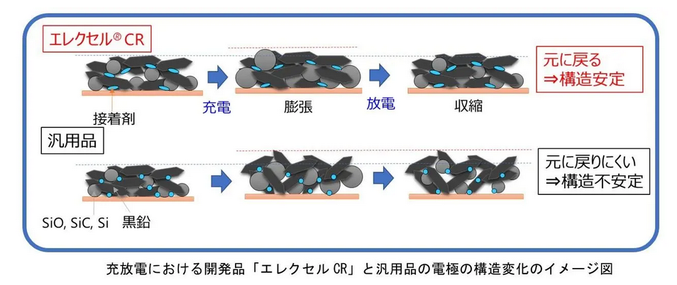 「エレクセルCRシリーズ」は、シリコン系材料100%配合系においても電極構造が安定し長寿命化を図ることが可能で、負極容量をさらに向上できる可能性がある。樹脂の弾性率や強度のコントロールを行い、汎用品では難しい負極材の膨張収縮に適応する性質を持ち、高い構造復元性を発揮する。