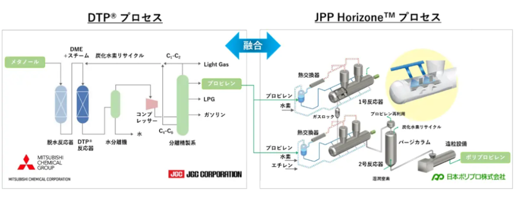 この共同調査では、カーボンリサイクルによる資源循環可能なポリプロピレンの製造技術の構築に向けて、日揮グローバルおよび三菱ケミカル株式会社が共同で保有するメタノールからプロピレンを製造する「DTPプロセス※1」と、日本ポリプロが保有するプロピレンからポリプロピレンを製造する「JPP Horizoneプロセス※2」の融合により、水素とCO2から製造されるカーボンリサイクル・メタノールを出発原料としてポリプロピレンまでを製造する融合プロセス全体の効率化を図ることで、製品ライフサイクルにおけるカーボンニュートラル、サーキュラーエコノミーの実現とプロセスの経済性の向上を目指す。
