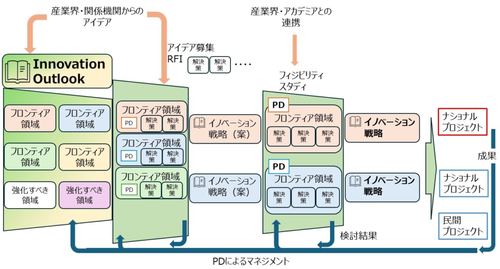 3)国家プロジェクトとして重点的に推進すべきフロンティア領域等については、経済産業省に対して提案を行い、経済産業省は自らの評価・分析や他の機関からの情報も踏まえ、重点フロンティア領域を選定し、フィジビリティスタディを実施する。