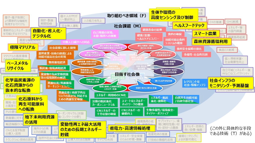 社会像、およびその背景となる市場・技術・政策動向、社会課題(M)を踏まえ、分析を行った結果、その解決のために機能・提供価値を取り組むべき領域(F)として捉えて全体俯瞰を示す。また、取り組むべき領域の中から将来性、革新性、日本の強み、経済安全保障上の重要性、民間でのリスクを踏まえ、フロンティア領域等を提案する。