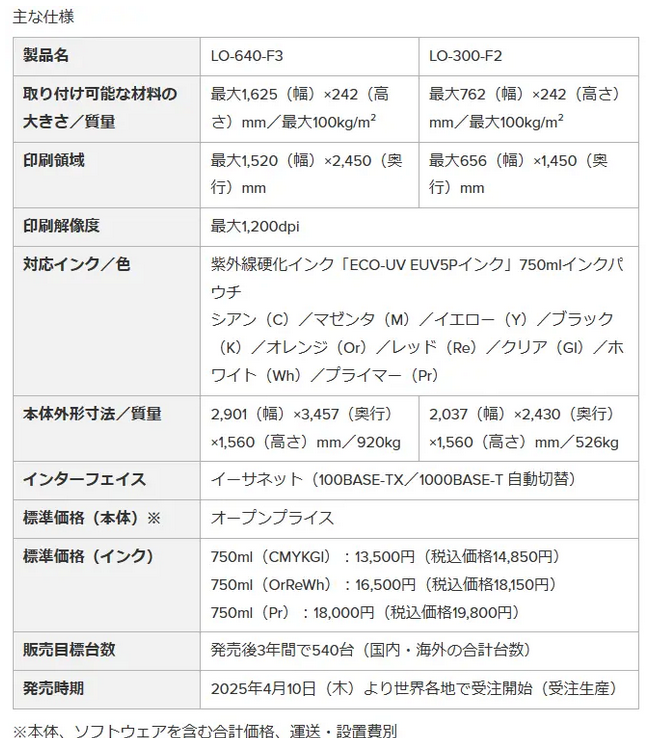 印刷可能範囲は、LO-640では幅1,520mm×奥行2,450mm、LO-300では幅656mm×奥行1,450mmのワイドなエリアを実現。また、両機種共に高さ242mm、重さ100kg/m2までの材料をセットすることが可能。