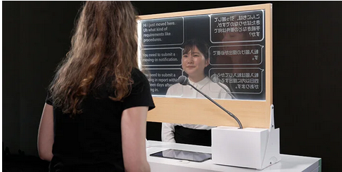 「 VoiceBiz® UCDisplay®」は、音声入力された言葉を相手の言語に翻訳し、透明ディスプレイに表示することで円滑な多言語コミュニケーションを実現するサービス。透過ディスプレイには音声入力とキーボード入力に対応した字幕表示ができるため、外国人のほか、日本人同士においても、聴覚障がい者や言語障がい者などへの対応が可能。字幕と表情が同時に見える透明ディスプレイを介し、より多くの人への情報伝達を実現することにより受付業務のユニバーサルコミュニケーションを支援する。