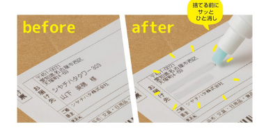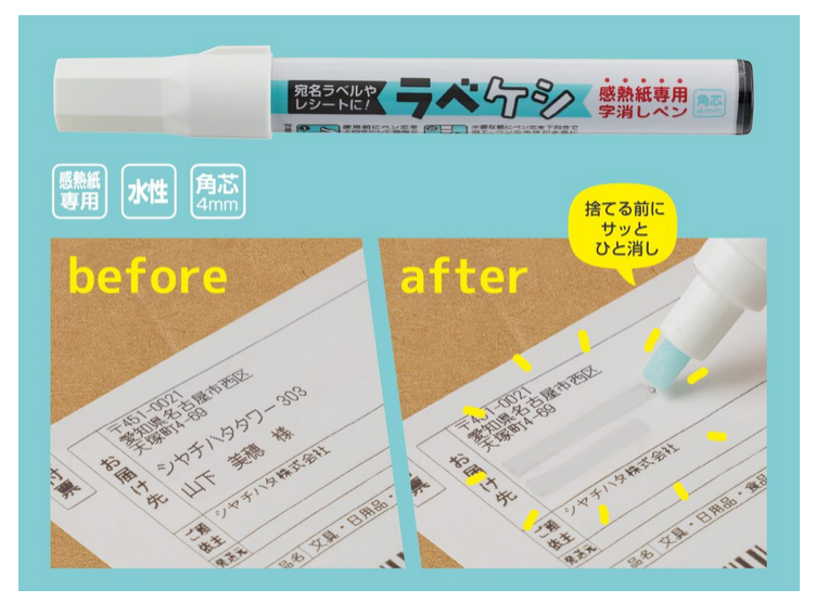 感熱紙の宛名ラベルやレシートの文字をなぞるだけで無色化し、消すことができます。塗ってそのまま廃棄できるのでラベルを破いたり、シュレッダーにかけたりする手間がない。