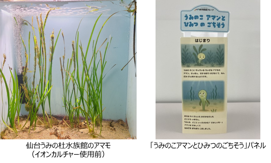 今回は、同水族館内にてイオンカルチャーを使ったアマモの成長観察のほか、本取り組みに関する展示を行うことで、来場者に自然と科学のつながりを伝える。