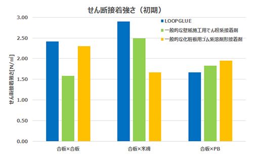 環境配慮型でありながら、従来の壁紙施工用接着剤と同等以上の高い接着強度を実現する。