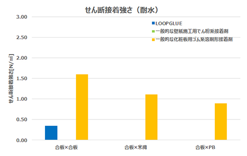 通常の使用環境下では一般的な壁紙用でん粉系接着剤、化粧板用ゴム系溶剤形接着剤と同等以上の接着強さを示しながら、水によって簡単にはがすことができる。