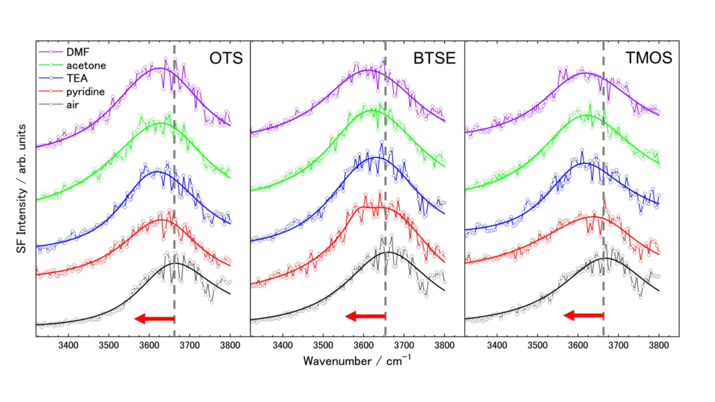研究チームはさらに、エポキシ接着剤の硬化剤として用いられるジシアンジアミド(アミン系硬化剤で、ルイス塩基として作用)をDMF中に溶かし、シランカップリング剤で処理した表面との界面をSFG分光法で調べた。その結果、接着強度の高い表面ほど水酸基の信号変化が大きく、ジシアンジアミドが界面に強く引き寄せられている様子が観測された。ルイス酸性の強い表面がアミンを強く引き付け、その相互作用が接着強度を高めているということが実験的に示された。