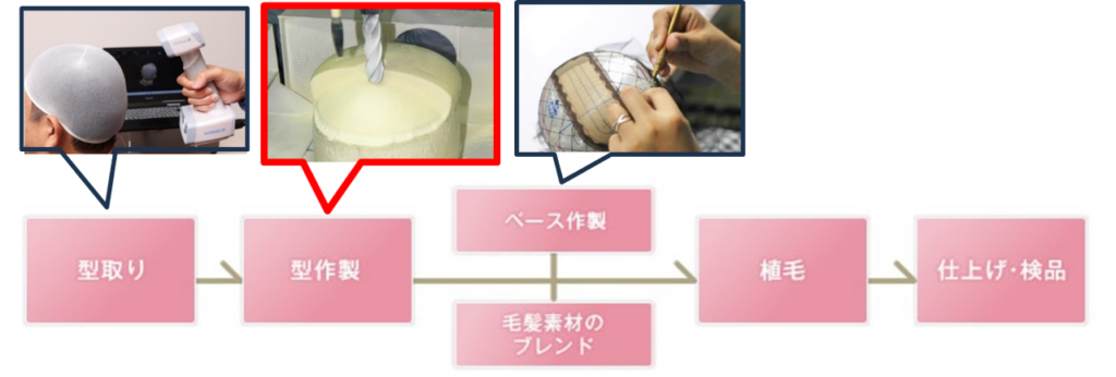 オーダーメイドウィッグは一人ひとりの頭部の形状に合わせて製作される。3Dスキャナーにて頭部の形状を正確に計測し、ウレタンの切削により頭部と同じ形状のモールドを作製する。寸法が正確なモールドは、頭部に優しくフィットするウィッグの基本となるため、素材には切削性および寸法安定性に優れるウレタンを用いる。削り出した型の形状に合わせて、ウィッグの土台となるベース(キャップ)を作製し、植毛工程を経てウィッグが完成する。
