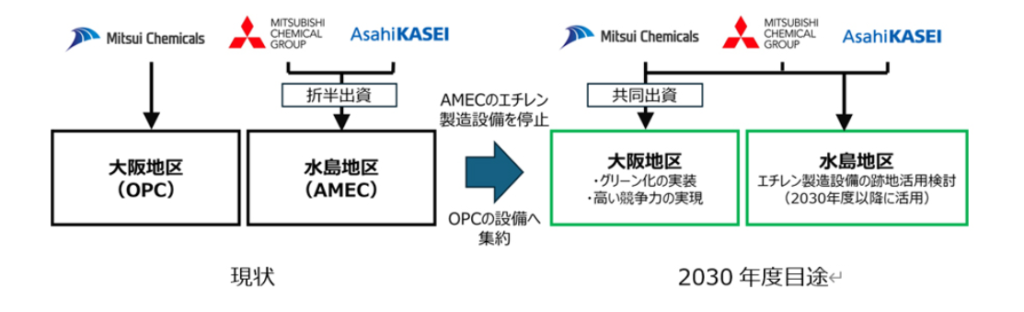 これを受けて、3社は西日本に各社が保有する全2基のエチレン製造設備について、新たに3社で共同事業体を設立の上、2030年度を目途に三菱ケミカル旭化成エチレン(AMEC)水島工場のエチレン製造設備(所在地:岡山県倉敷市)を停止し、大阪石油化学株式会社(OPC)の設備(所在地:大阪府高石市)へ集約することで合意し、基本契約を締結した。