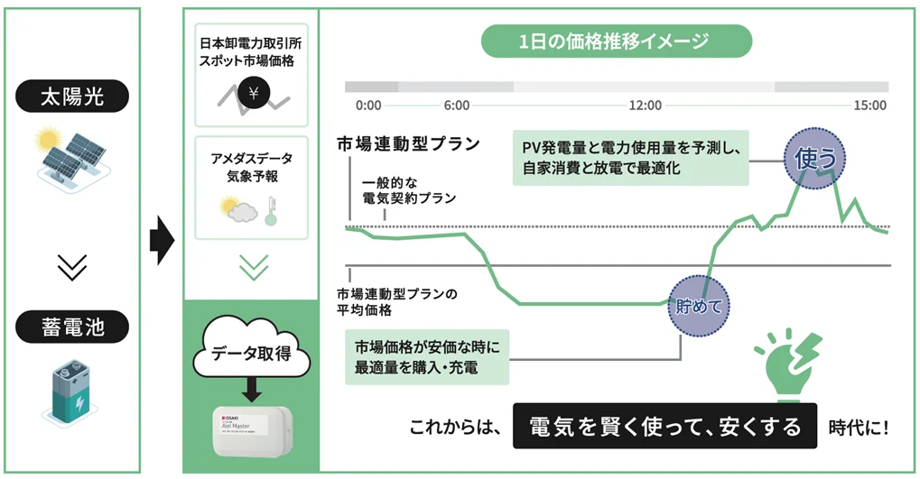 エッジAI制御により、電力会社が提供する「市場連動型プラン」で安価な電力を購入。市場価格が高騰する時間帯の電力調達を抑える。