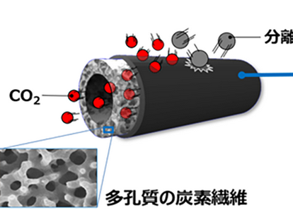 中空糸状の多孔質炭素繊維の支持体表面に、薄い炭素膜の分離機能層を形成した二層構造により、高い分離性能を持つCO₂分離膜。支持体を極限まで細径化することで膜モジュールの軽量化・コンパクト化が可能となる。
