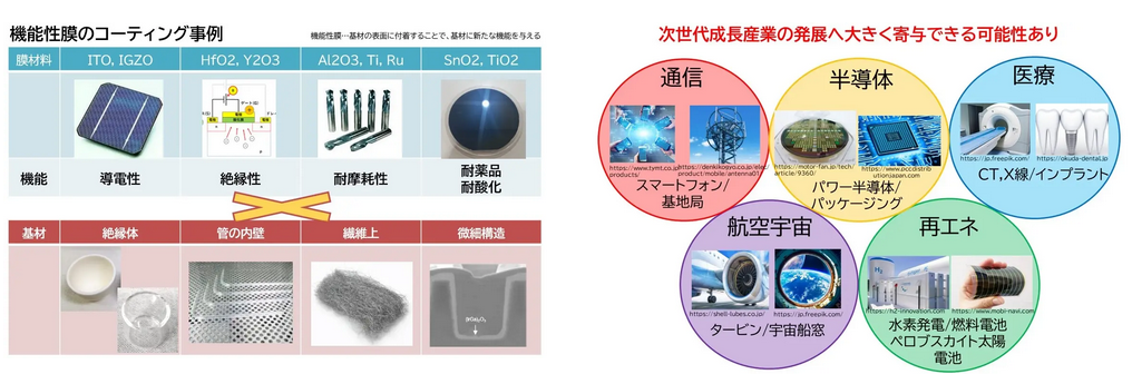 ユニバーサルめっき法では、高品質で緻密な機能性膜の形成が可能となり、「通信」「半導体」「医療」「航空宇宙」「再エネ」等の次世代成長産業の発展へ大きく寄与できる可能性がある。