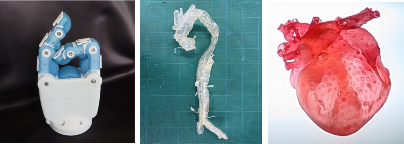 左から、ロボットハンドの指部分(青の部分)、大動脈血管モデルの3D造形、心臓モデルの3D造形