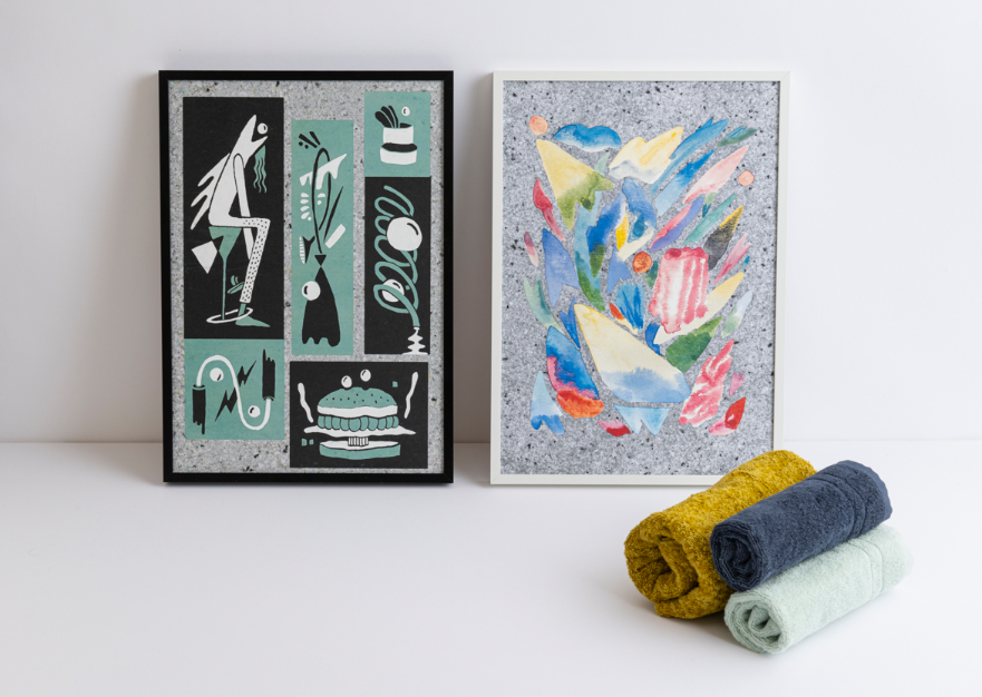再生したボードには、プロジェクトに賛同するアーティストの作品を高精細プリントで表現。コットン素材の繊維の表情や端材形状の違いにより、ひとつひとつ微細な個性が生まれるため、同じものは二つとない。インテリアとしてもアートとしても楽しめる、ユニークで特別なプロダクトに仕上がる。