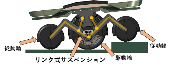 この度、その重要な構成要素である「リンク式サスペンション」の技術検証が完了し、開発プロセスを大きく進めることができた。リンク式サスペンションとは、パンタグラフ形状のリンク機構を介して駆動輪・従動輪を接続している装置であり、屋外での整備されていない路面や、段差などで路面に凹凸があっても駆動輪を確実に接地させることができるため、サービスロボットの安定した推進力と走行性能を確保できる。