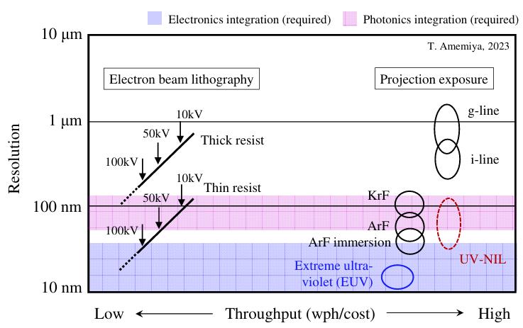 そのような中で、半導体の製造技術を用いてウェハ上に⼤規模な光回路を構築する集積フォトニクス分野でも、NILを導入できる可能性がある。集積フォトニクス分野において特に高い解像度が必要とされる場面は、DFB(分布帰還型)レーザー(用語5)における回折格子の形成、光回路の入出力に使用するグレーティングカプラ(用語6)の形成、シリコンフォトニクス光回路における導波路の形成などであり、いずれも100nm程度の解像度が保証されていれば十分といえる(図1の赤帯域)。そのため、上記プロセス工程では、NILの⼤面積転写性や高スループット性を⼤いに活かすことができ、かつコストの観点からも優位性があると考えられる。