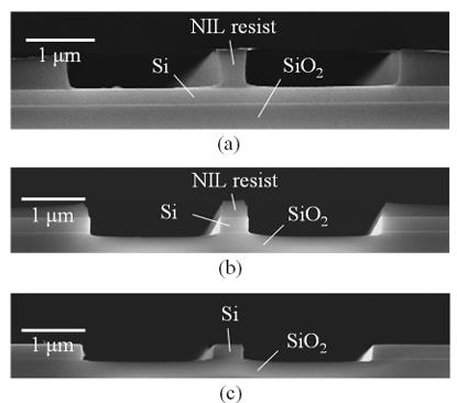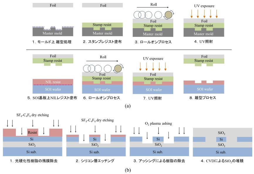 NILによるパターン形成後は、光硬化性樹脂の除去にO2プラズマアッシングを用いる点を除いて、標準的なシリコンフォトニクスプロセスと同一の手順。エッチング工程では、十分な垂直性を維持したまま、標準的なシリコン導波路パターンを形成できることを確認した(図4b)。
