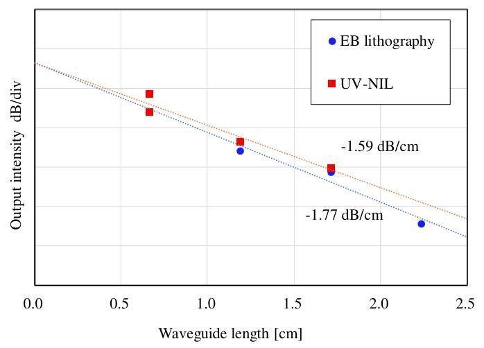 今回開発したプロセスで作製したシリコン導波路の伝搬特性を評価した結果、波⻑1550nmのTEモード光に対する単位⻑さ当たりの伝搬損失は1.6 dB/cm程度となった(図5)。これは、従来のドライArFが用いられる90nm CMOS試作ラインや電子線描画を用いて作られたシリコン導波路と遜色ない値であり、NILによって十分な性能を持つ光回路が形成可能であることを示している。