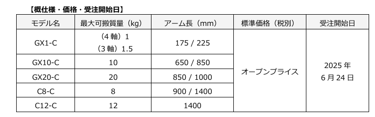 エプソン販売は、産業用ロボットの新商品として、スカラ(水平多関節)ロボット『GX1/10/20-C』シリーズおよび6軸(垂直多関節)ロボット『C8/12-C』シリーズを2025年6月24日より受注開始する。