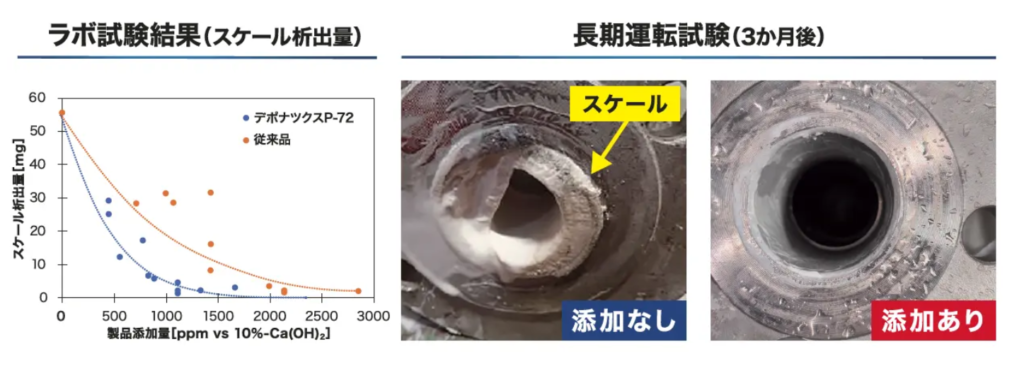 さらに、カルシウムスケール析出の大きな課題を抱える半導体工場の排水処理消石灰ラインにおいて、3カ月間の長期運転後に配管内を確認した結果、「デポナックス P-72」を添加することにより、配管内のカルシウムスケール析出を大幅に低減できることが確認された。