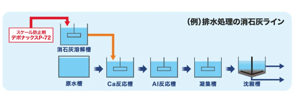 既存排水処理の消石灰ライン例において、「デポナックスP-72」を添加するだけで容易に適用可能です。