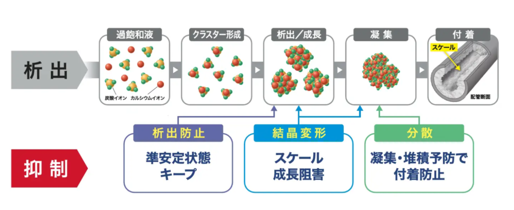 ①スケールの析出を抑制し準安定状態を維持する作用、② スケール結晶の成長を阻害する作用、③ 凝集・堆積を防止し付着を抑える分散作用、という3つの異なる作用機構により、カルシウムスケールの発生を総合的に抑制する。