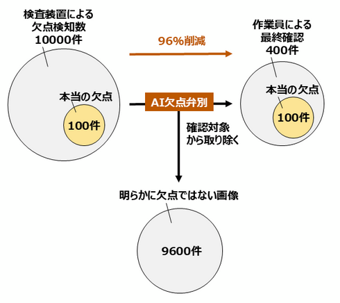 従来、不織布製造工程では、検査装置が検出したすべての欠点画像を作業員が目視で確認しており、検出画像には実際には欠点ではない画像も多数含まれるため、大きな負担となっていた。この課題を解決するため、同社はJR西日本と共同で同システムを開発し、AIが検査装置による検出画像から欠点候補を自動的に絞り込み、作業員はその欠点候補を最終確認することで検品を完了できる仕組みを構築した(図1)。その結果、スパンボンド製品の一部銘柄で、作業員による欠点画像の確認件数が96%削減した。さらに、従来は手作業で記入していた欠点記録も自動で作成できるため、検品業務の大幅な省力化が可能になった。