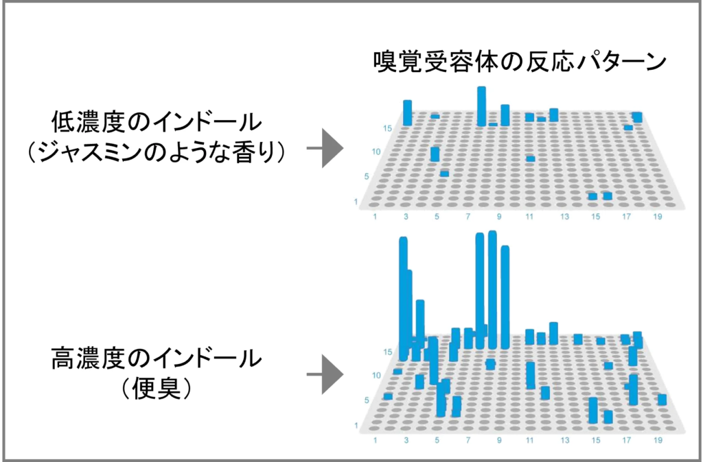 例えば、花弁を原料とするローズオイルと、葉や枝を原料とするゼラニウムオイルは、花の種類も原料とする部位も異なるが、よく似た香りを持っている。そこで、ローズオイルとゼラニウムオイルそれぞれに対する嗅覚受容体の反応パターンを確認すると、その形は類似していた。また、インドールというにおい物質は、薄い濃度では好ましいジャスミンのようなフローラルな香り、濃い濃度では不快な便臭に感じるが、嗅覚受容体の反応パターンも、濃度によって異なる結果を示した(図2、3)。