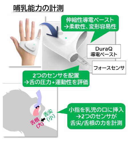 西准教授は、赤ちゃんの舌の動きの計測に長年取り組んできた。この知見を基に、住友ベークライトと共同研究を実施し、同社の DuraQ®導電ペーストの技術を生かした「哺乳センシングデバイス・システム」の開発に成功した。「哺乳センシングデバイス・システム」は、赤ちゃんの舌の動きを計測・解析することで、吸てつの状態を客観的に評価できる画期的な製品。これにより、母親や医療従事者が授乳状況を正確に把握し、より適切な母乳育児支援を行うことが可能となる。