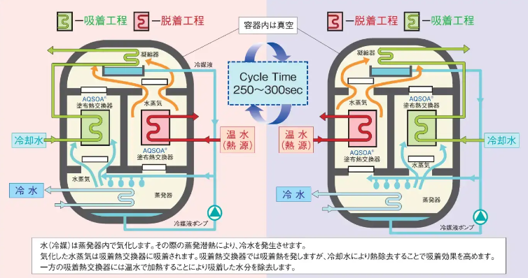 POLASTECHのAHPシステムは、この低温排熱を直接エネルギー源として活用できる点が最大の特長。従来の電力依存型冷却方式とは異なり、排熱そのものを駆動源として冷熱へ転換することで、