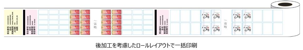従来、刃型違いのジョブの場合にオペレーターがSurePressへ張り付き、ワンジョブずつ基材を降ろしていたが、加工工程に必要な情報をSurePressにて自動挿入し、刃型違いの複数ジョブの連続印刷を実現し、ラベル印刷~後加工における工程を「一括印刷機能」で自動化した。ジョブ毎の基材の上げ下ろしが不要となるので、オペレーターが1本のロール紙を印刷する間に張り付く必要がなくなり、他の仕事との兼務が可能。1人でSurePressを複数台稼働することもでき、運用の効率化を図ることもできる。