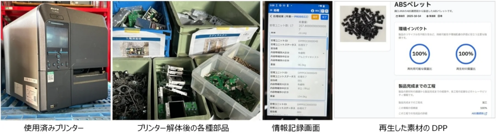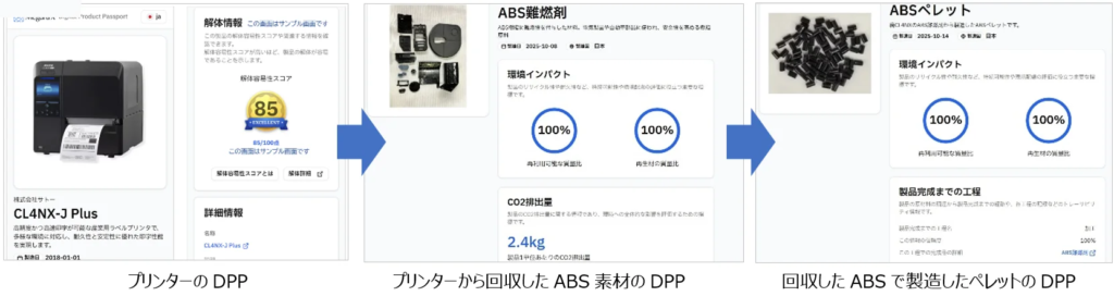 ラベルプリンターの製造情報・素材情報・解体手順を外部システムと連携し、DPP上で一元的に参照できることを実証した。また、解体工程における作業時間、回収率、再生材の重量・色などの実データを取得し、解体プロセスを定量的に評価できることを確認した。さらに、連携データをDPP上で表示することで、製品のシリアル番号まで遡って情報を参照できるトレーサビリティが技術的に実現可能であることを示した。これにより、再生材の由来・品質の透明性向上につながり、企業のESG・調達領域における説明責任を強化できることが確認された。