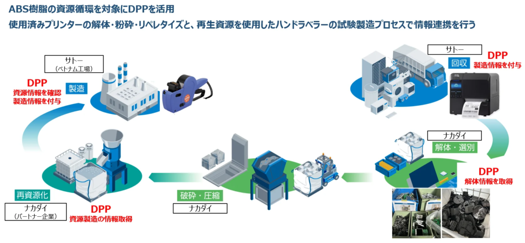 PoCは、サトー製ラベルプリンターを対象に、使用済み製品の回収から解体・破砕、ABS樹脂の再生処理、さらに再生素材を用いたハンドラベラーの試験製造に至るまでの一連の工程にDPPを導入し、その運用方法および情報活用の有効性を検証するもの。