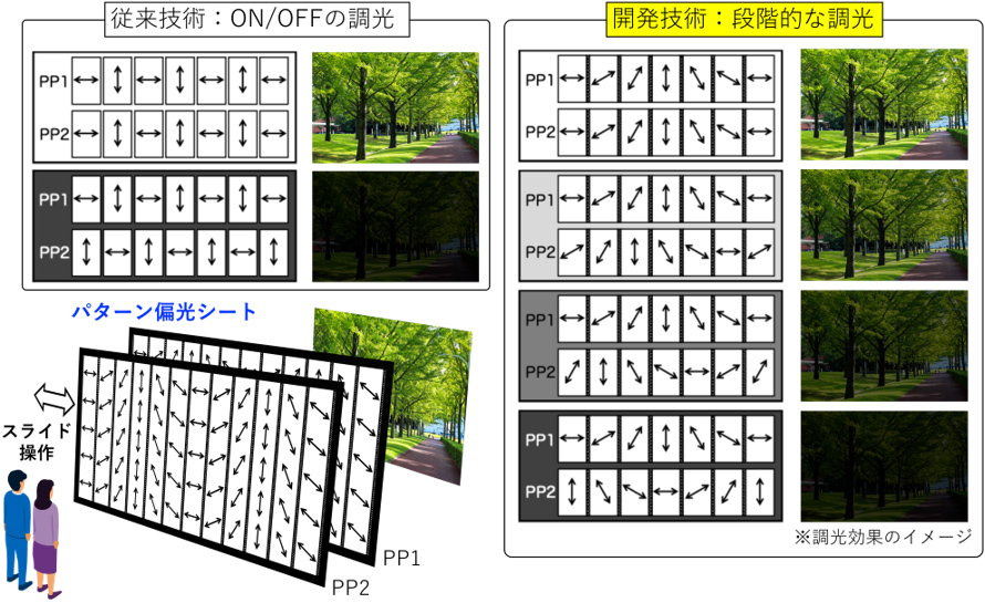 今回開発した調光ブラインドは、重ね合わせた2枚のシートを数ミリメートル程度スライドさせるだけで、従来はON/OFFしかできなかった光の透過率を多段階で調整できる。そのため、日差しがまぶし過ぎると感じたときに片手で手軽に快適な明るさに操作できる。シートは、専用に設計された偏光パターンをナノインプリント※1技術で一括に製造できる。光の透過率の制御に電源を必要とせず、近赤外・赤外光の調光も可能なため、住宅向けのニーズがある遮熱効果の調節への応用が期待できるほか、将来的にはセンサー周辺部材への活用などより幅広い分野への展開が期待される。