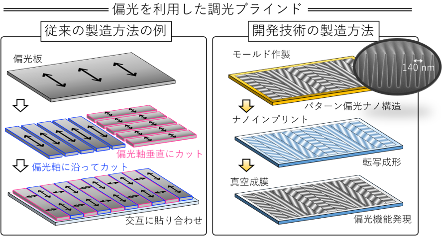 図3に作製に用いたモールドと作製したパターン偏光シートを、図4に開発した多段階調光ブラインドの写真を示す。直線偏光のディスプレイに作製したパターン偏光シートをかざして観察すると、帯状の段階的な明暗模様が確認でき、帯状エリア毎に偏光軸が異なるレイアウトが実現できていることが分かる。これを2枚重ね合わせた多段階調光ブラインドにおいて調光機能の実証に成功し、スライドする位置を0mm、2mm、4mm、6mmと操作したとき、可視光の透過率が30%、24%、13%、4%と段階的な調光制御ができることを確認している。この調光範囲を拡張する開発を進めており、ニーズに合わせてより明るい範囲で調光したり、より暗い範囲で調光したりすることもできる。住居の窓だけでなく、手軽に導入し操作できる特長を生かして、オフィスや打ち合わせスペースの小窓、自動車や電車など移動体の窓、照明機器など幅広い用途での応用が期待できる。また、可視光だけでなく、近赤外や赤外線など波長が長い電磁波でも機能するため、住宅用などでニーズのある遮熱効果の調節への応用が期待できる。センサー用途(車載用赤外センサーなど)においても周囲の状況に応じてノイズとなる環境光の光量調整のニーズに応えることが期待でき、他には電磁波のシャッターのような使い方にも展開される可能性がある。