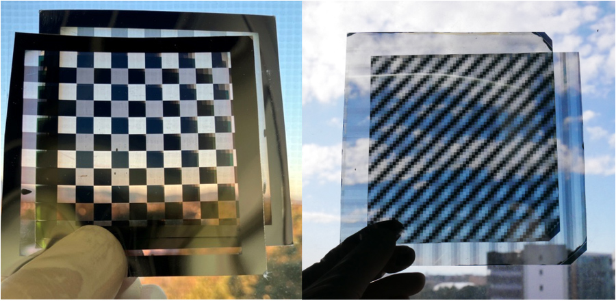 今後は、大面積化技術の構築・耐久性評価を進め、企業との連携を通じて本技術の社会実装を推進し、あらゆる生活環境、ビジネス環境での省エネ・快適性向上を目指す。さらに、図5に示した応用例のように、パターン偏光シートは意匠性を付与した偏光アート表現なども可能。住宅用ブラインドの調光時に模様を浮かび上がらせるといった応用もできるほか、アート分野、エンターテインメント分野などで応用が期待できる。こうした異分野への展開も視野に入れ、幅広い用途での研究開発を進める。