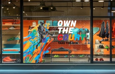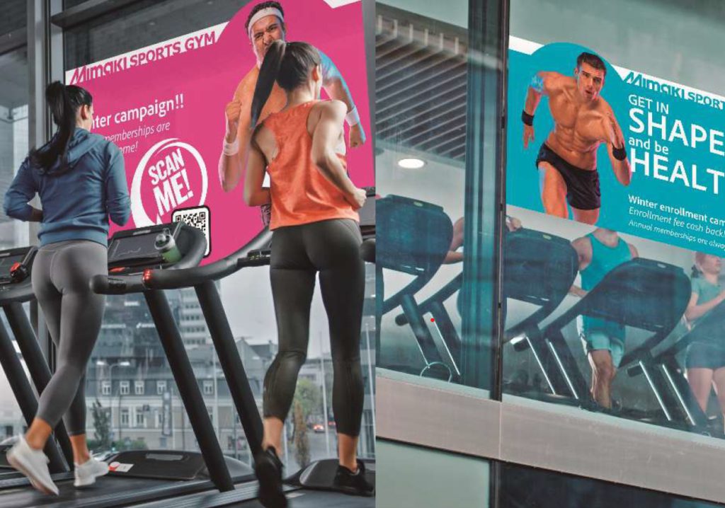 さまざまなロール素材への安定した出力を実現するため、同製品には同社が新たに開発したベルト搬送システム(図1)を採用した。従来のグリットローラーによる搬送方式では対応が難しかった薄手のフィルムや布地も、弛みやシワの発生を抑えながら安定して搬送することが可能(図2)。これにより、ウィンドウグラフィックやファブリックサインなど用途を広げ、展示会ブースや店舗空間のグラフィックを一括して提案できる。