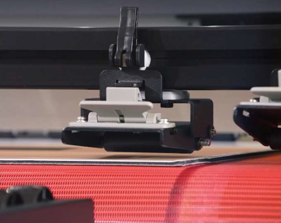 さらにこの搬送システムは、リジッド素材の出力時にも高い安定性を発揮する。オートバキュームと前後のロックローラーユニット(図3)により、最大4x8サイズ*1のアルミ複合板や、2インチ厚のカルプ板といった大判・厚物素材も安定して搬送(図4)。これまで貼付け工程や外注に依存していたリジッド制作を、自社内で効率化し完結する生産体制へと変えていく。